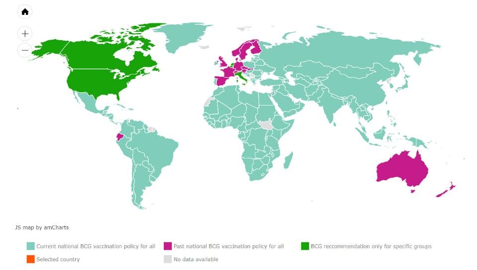 Картата на BCG World Atlas показва данните за ваксинация с БЦЖ в различните страни. В бледо зелено са оцветени държавите, които имат държавна политика за имунизациа с БЦЖ ваксина. Тези в лилаво са имали програми за ваксинация в миналото, но вече не. В оцветените с ярко зелено страни БЦЖ ваксините се прилагат само при специфични групи от населението, а за тези в сиво липсват данни.
