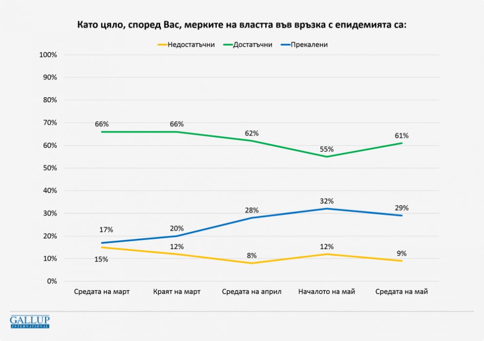 На този фон 61% намират мерките на властта срещу коронавируса за достатъчни, 29% – за прекалени и 9% – за недостатъчни. Има и малцина колебаещи се. След седмиците на постепенен спад в дяловете на определението „достатъчни“ и ръст на определението „прекалени“, сега вече и тук очевидно има установяване около определени нива.