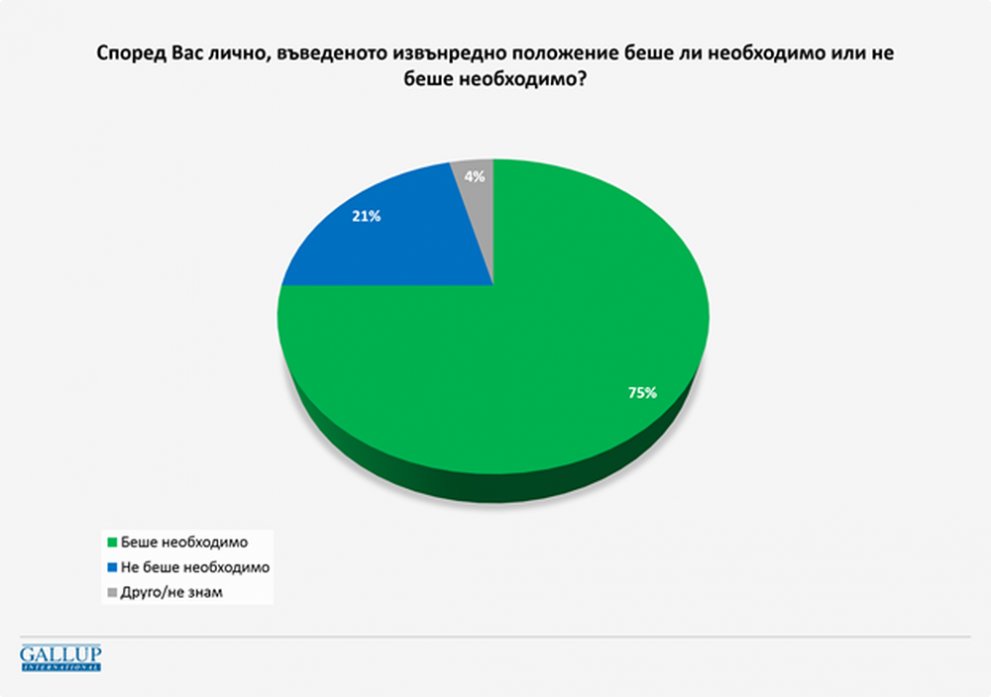 От дистанцията на времето, решението за въвеждане на извънредно положение в страната за последните два месеца е оценено положително. Мнозинство от 75% от респондентите вярва, че това решение беше необходимо. Малко над една пета (21%) от запитаните го намират за ненужно. Останалите не могат да преценят.