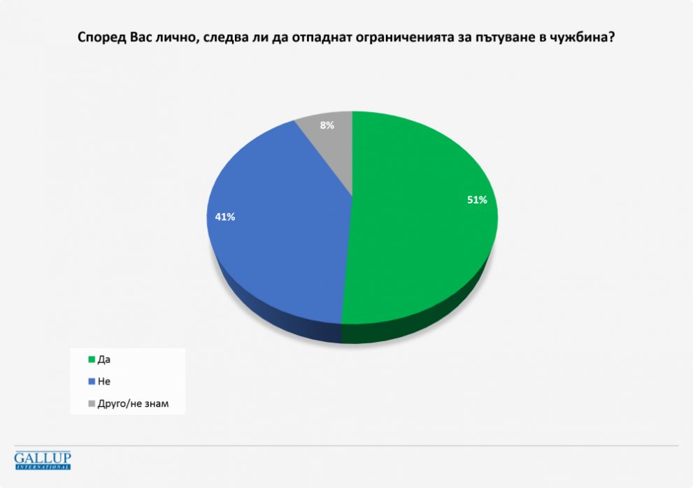 51% от българите смятат, че ограниченията за пътуване в чужбина вече трябва да отпаднат. 41% не са съгласни. Останалите се затрудняват да отговорят.