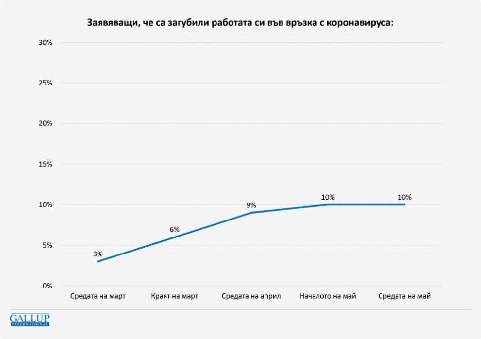 Няма сериозна промяна спрямо предходния сондаж и по отношение на дела на българите, които очакват да загубят своето работно място – 9%. Всичко това означава, че и тревогата за прехраната, която си пробиваше път в последните месеци, сега вече се установява на определени равнища и остава висока.