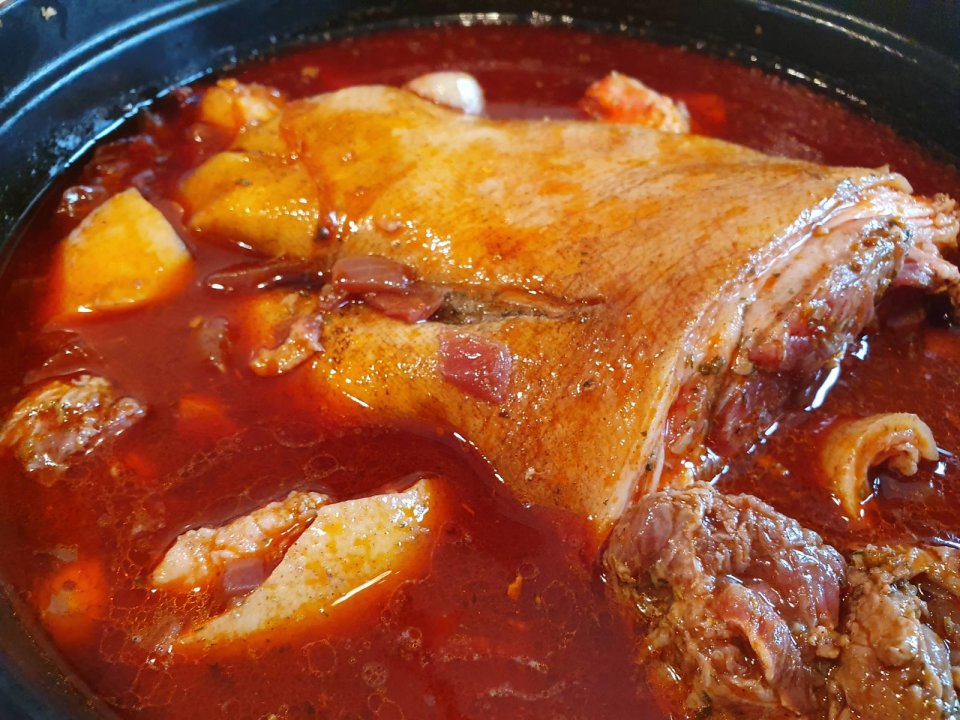 „Взимате един керамичен гювеч и вътре слагате натритият със сол и черно пиперче джолан, за да направите пушения сос запържете в тиганче, нарязаните на ситно лук и чесън, добавете щипка захар и малко мед и 500 мл. червено вино. Щом намали обема си на половина добавете около 500 мл. вряла вода, барбекю сосът и червения пушен пипер, който по ваш вкус може и да е леко лют. Нека поври още 2-3 мин. и прехвърлете в гювеча при джолана, захлупете и печете във фурна 120 градуса 8 часа. За гарнитура към него може приготвите картофено пюре или ориз.