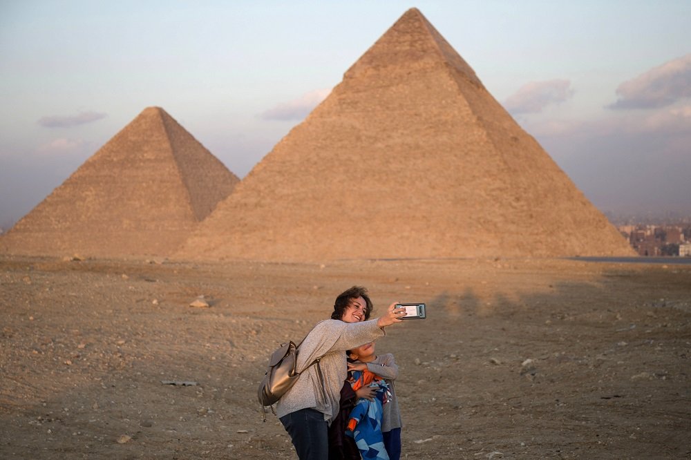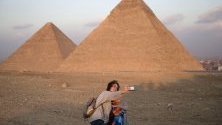 Желаещите да разгледат пирамидите в Гиза преминават през проверка на температурата и трябва да следват специалните обозначения за спазване на дистанция.