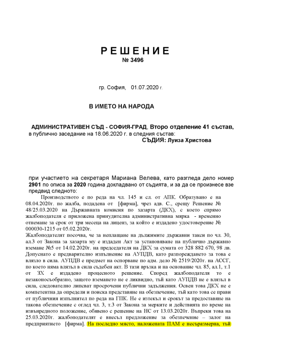 Лицензът на хазартната компания беше отнет временно за 3 месеца на 25 март. Основание за отнемането на лиценза бе акт за невнесени държавни такси в размер на 328.9 млн. лв. за периода 1 февруари 2014 г. - 31 декември 2019 г.