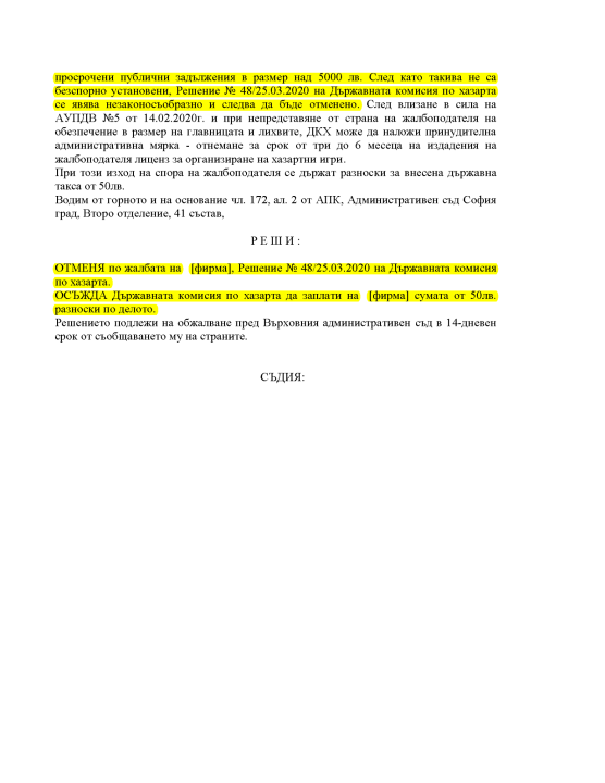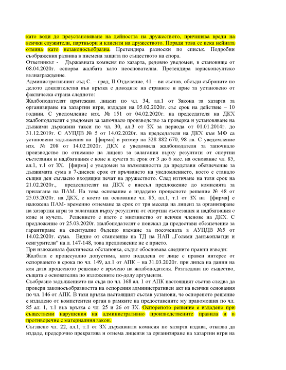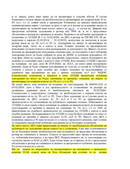 Дружеството на Божков е оспорило въпросния акт в съда и той не е влязъл в сила, като съществуването на просрочени задължения към държавата не е безспорно установено, констатира Административният съд. Затова според решението на съда отнемането на лиценза е грубо нарушение на законодателството.