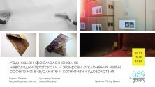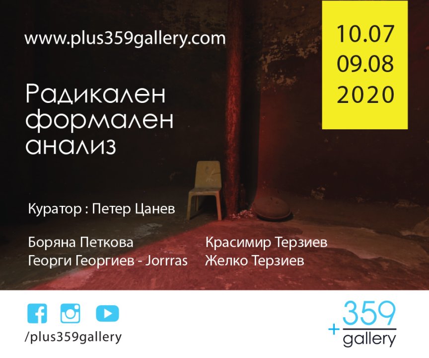 На 10 юли в пространството на галерия +359 се открива изложбата „Радикален формален анализ: невалидни протоколи и жанрови отклонения извън обсега на визуалните и когнитивни удоволствия“. Кураторският проект е на Петер Цанев и включва концептуални стратегии и творби на Красимир Терзиев, Желко Терзиев, Боряна Петкова и Георги Георгиев-Жорррас, съобщиха от галерията.