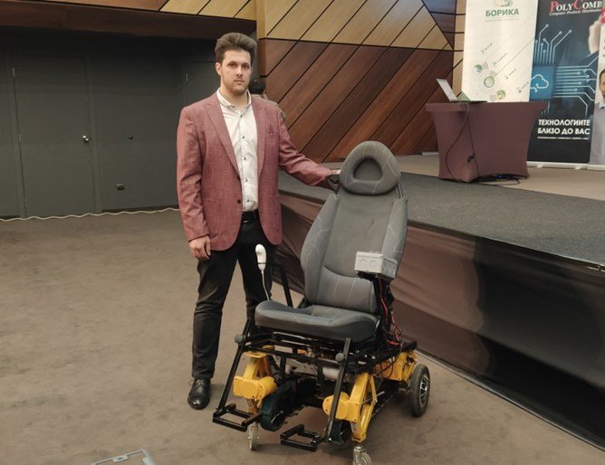 “Количката се изкачва по стълби назад и човекът е с гръб, за да може да е по-стабилен, когато иска да премине препятствие, той трябва да заходи назад, докато опре до стъпалото или бордюра. Има обозначени копчета за всеки един механизъм - предницата да премине от колесен във верижен режим, после се повдига седалката, за да може човекът да не се изхлузи и да бъде по-безопасно. След това се вдигат и задните гуми и се натиска бутон за задвижване на самата верига”, пояснява Теодор.