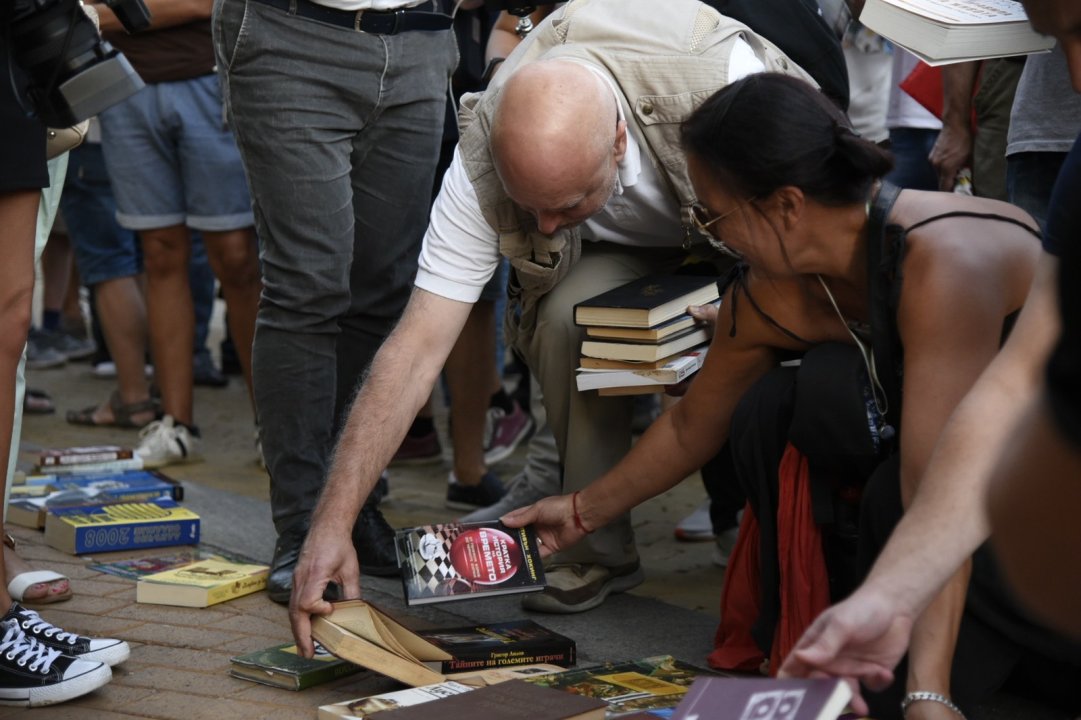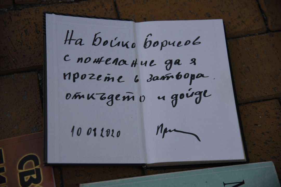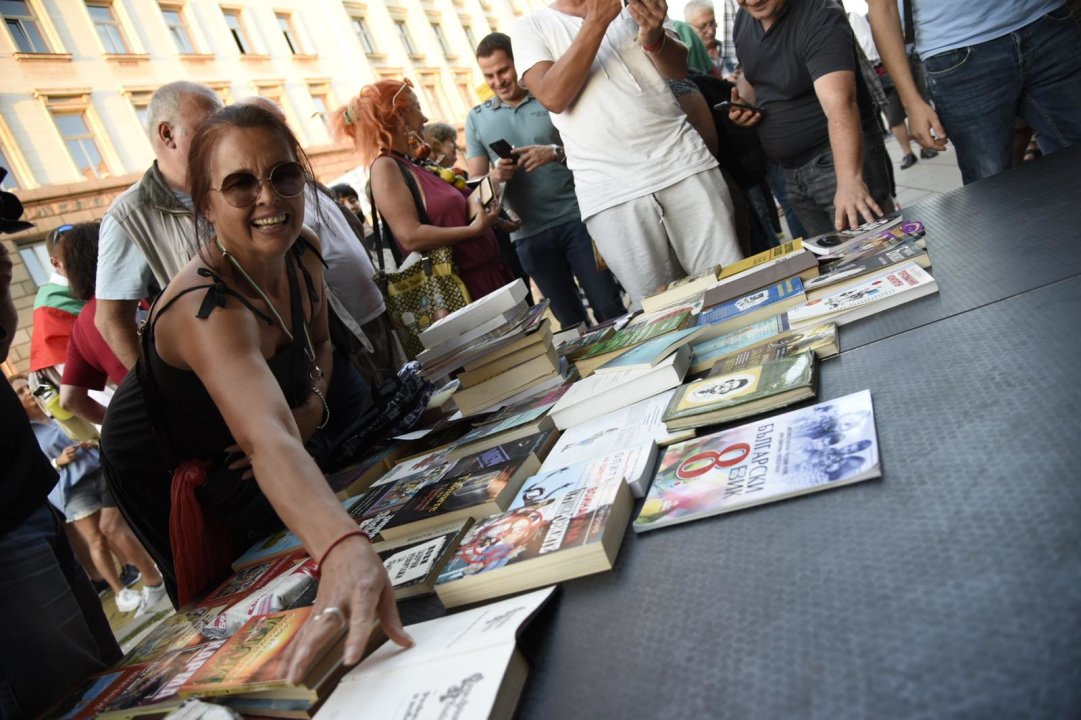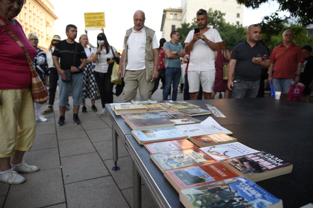 След като наредиха донесените книги на платформата, протестиращите ги взеха и отнесоха пред сградата на Министерски съвет, където ги подредиха. Сред тях има Читанка, учебници, наръчник по политика, любимата книга на премиера - "Винету", както и екземпляр на гръцкото издание на "Бай Ганьо" с лика на Бойко Борисов отпред.