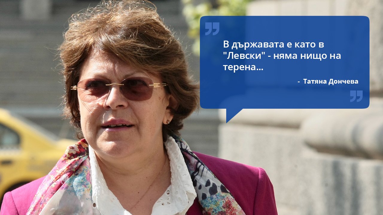 "Ситуацията в държавата е като ситуацията в "Левски" - няма нищо на терена, абсолютно всичко е разрушено". Това коментира лидерът на "Движение 21" Татяна Дончева във връзка с политическата криза в страната.