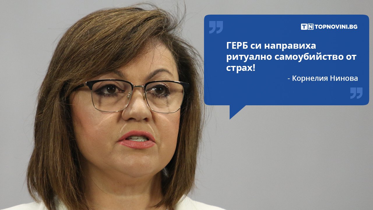 "Днес ГЕРБ и управляващото мнозинство си направиха ритуално самоубийство от страх. Да имаш мнозинство, да можеш да вземеш всички решения, които искаш и да не го направиш, показва страх. Страх от въпросите на опозицията, от протеста и от истината", заяви Корнелия Нинова, след като ГЕРБ и "Обединени патриоти" не се регистрираха в пленарната зала и провалиха извънредното заседание на парламента.
