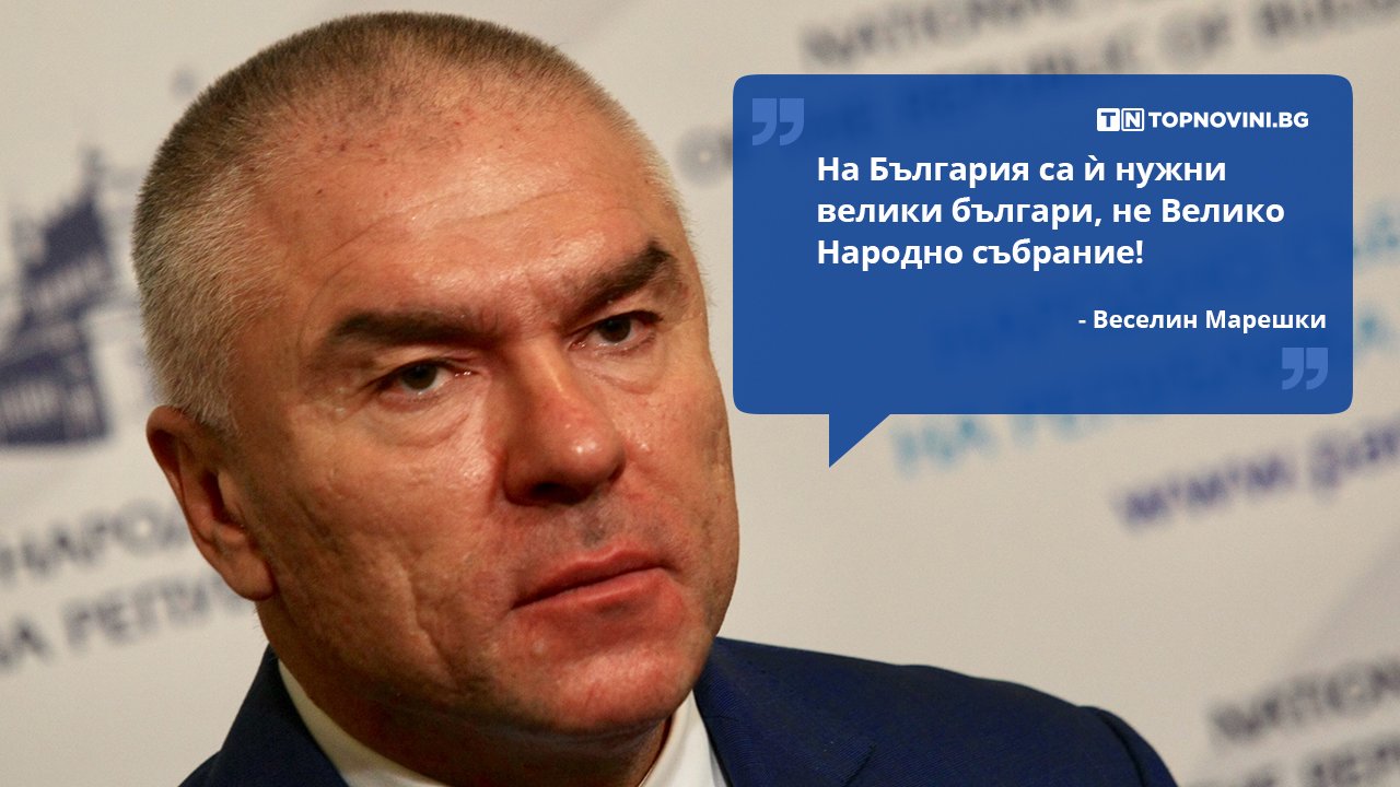 "България днес няма нужда от Велико народно събрание. Тя има нужда от велики българи. Тези велики българи, които да изградят една модерна, могъща, просперираща България". Думи на лидера на партия "Воля" Веселин Марешки във връзка с идеята за свикване на Велико Народно събрание.