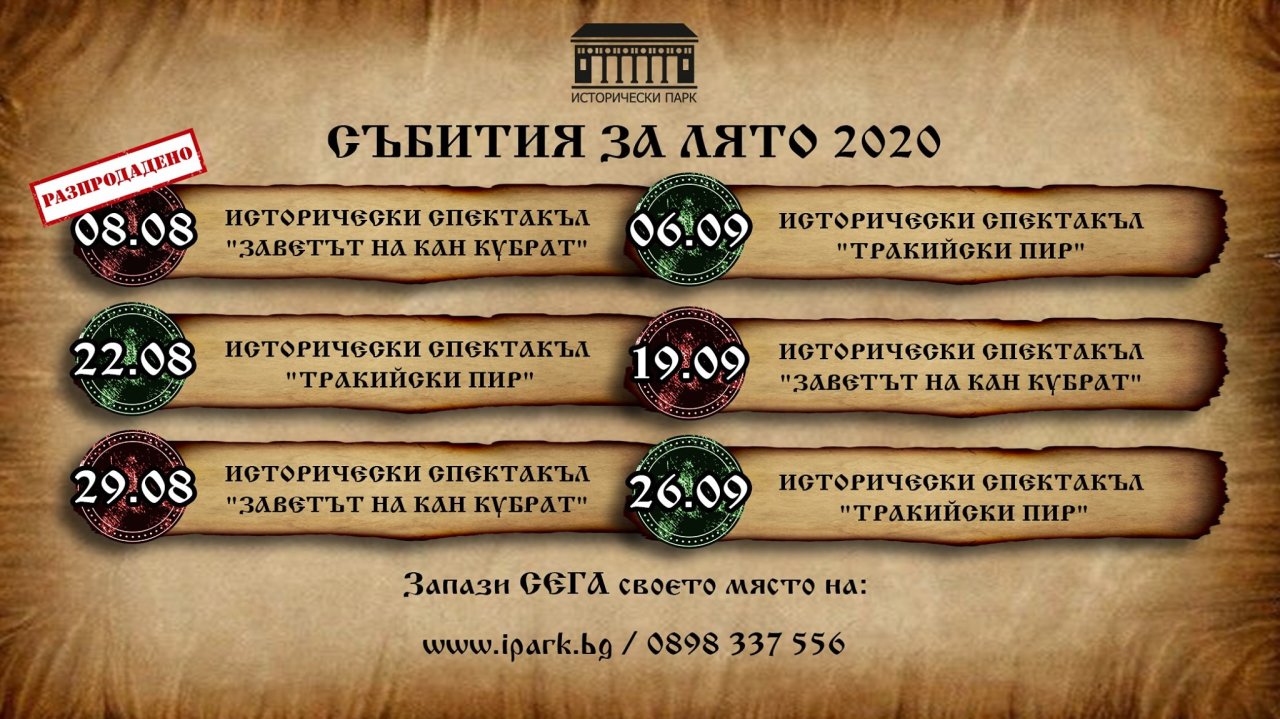 На 8 август в Историческия парк край Варна и непосредствено пред единствения възстановен в света Тракийски дворец, се проведе първият исторически спектакъл - „Заветът на кан Кубрат“. Актьори и възстановчици влязоха в ролята на велики прабългари, за да „потопят“ посетителите в магията на завещаното и силата на това, което в последствие се превръща в един от най-големите завети за българите, предавал се от поколение на поколение и така до днес, съобщиха от парка.