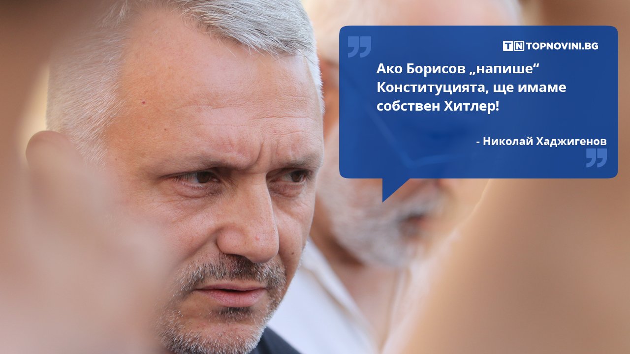 "Няма да допуснем диктатурата да се узакони официално. Сега има мека диктатура, която е незаконна. Допуснем ли Борисов да "пише" конституция, диктатурата ще стане законна - ще си имаме собствен Хитлер на Балканите". Думи на адвокат Николай Хаджигенов от "Отровното трио" във връзка с предложените от ГЕРБ идеи за нова конституция.