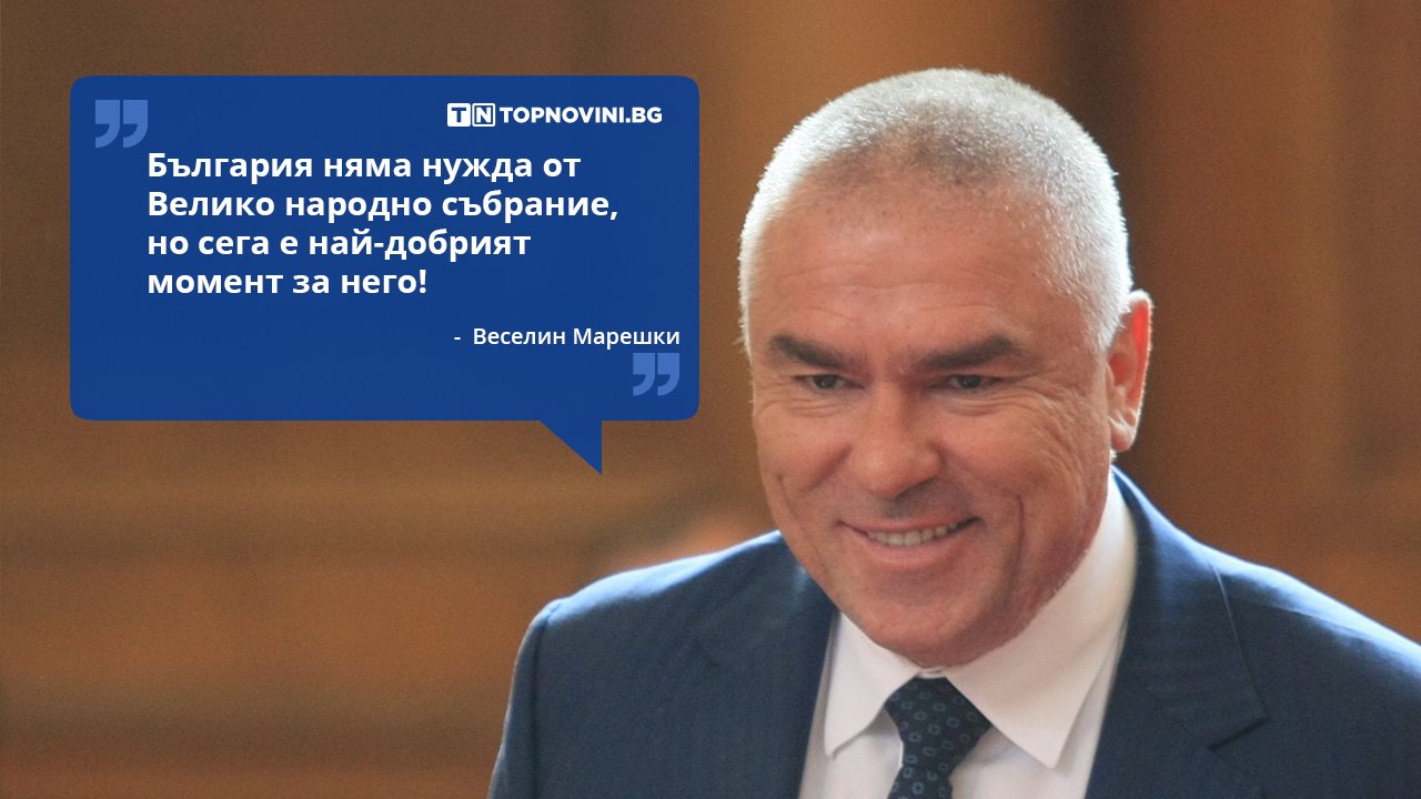 „Ние от „Воля“ сме единствените, които през годините сме казвали, че Великото народно събрание (ВНС) е институция, която е ненужна. От 2015 г. всички казват, че ВНС трябва да се свика и да се промени Конституция и аз казах, че ако трябва да има ВНС, сега е най-доброто време". Думи на лидера на ПП „Воля“ Веселин Марешки по повод предложенията за нова конституция и свикване на Велико народно събрание.