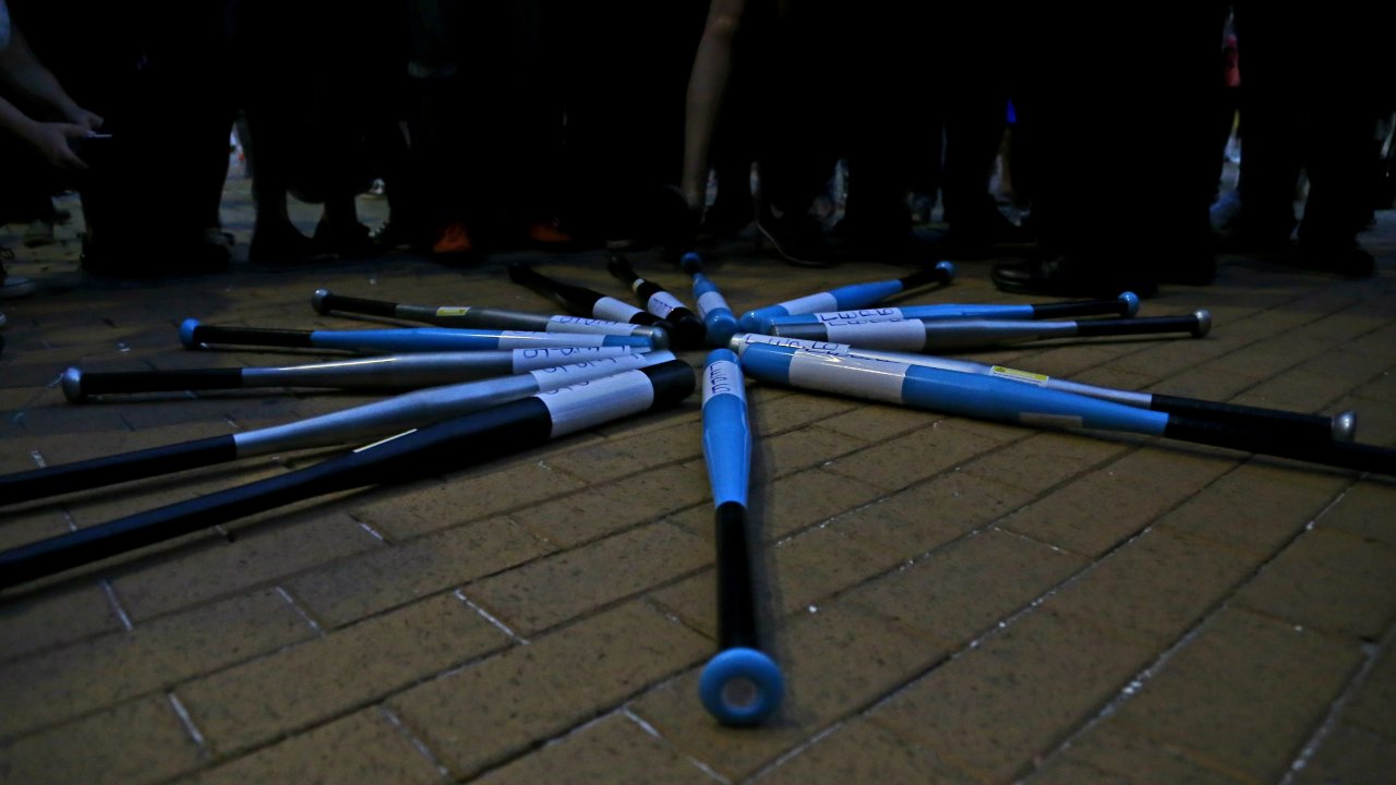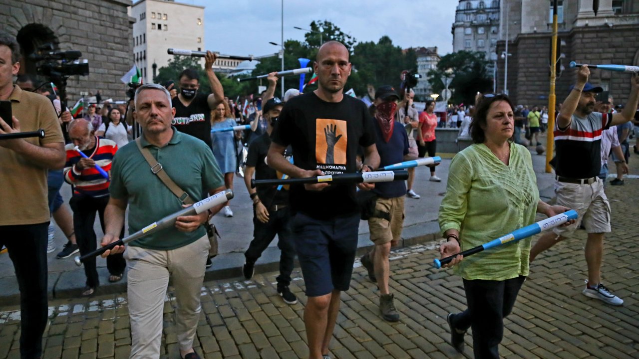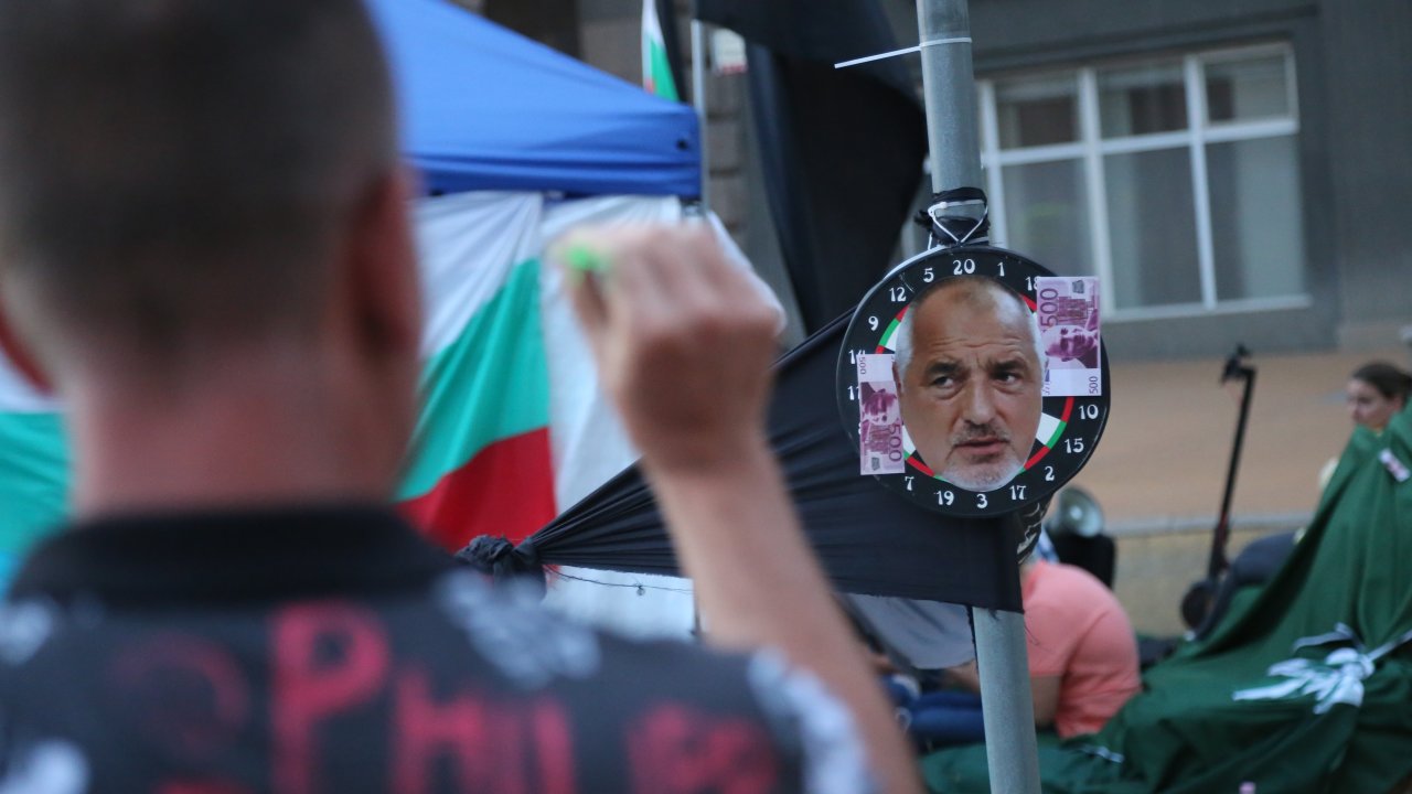 Протестиращите наредиха бухалки с надпис "ГЕРБ" пред Министерски съвет. С тях символизираха начина, по който мутрите са преминали прехода. "Държавата на Борисов се управлява по правото на силата, а ние искаме да се управлява със силата на правото", заяви Арман Бабикян.