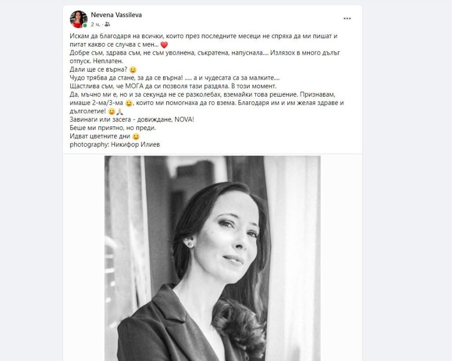 Водещата на новините Невена Василева обяви във Facebook профила си, че напуска Нова телевизия. Тя уточни, че не е уволнена, съкратена или напуснала, а е излязла в много дълъг неплатен отпуск, след който няма да се върне в телевизията.