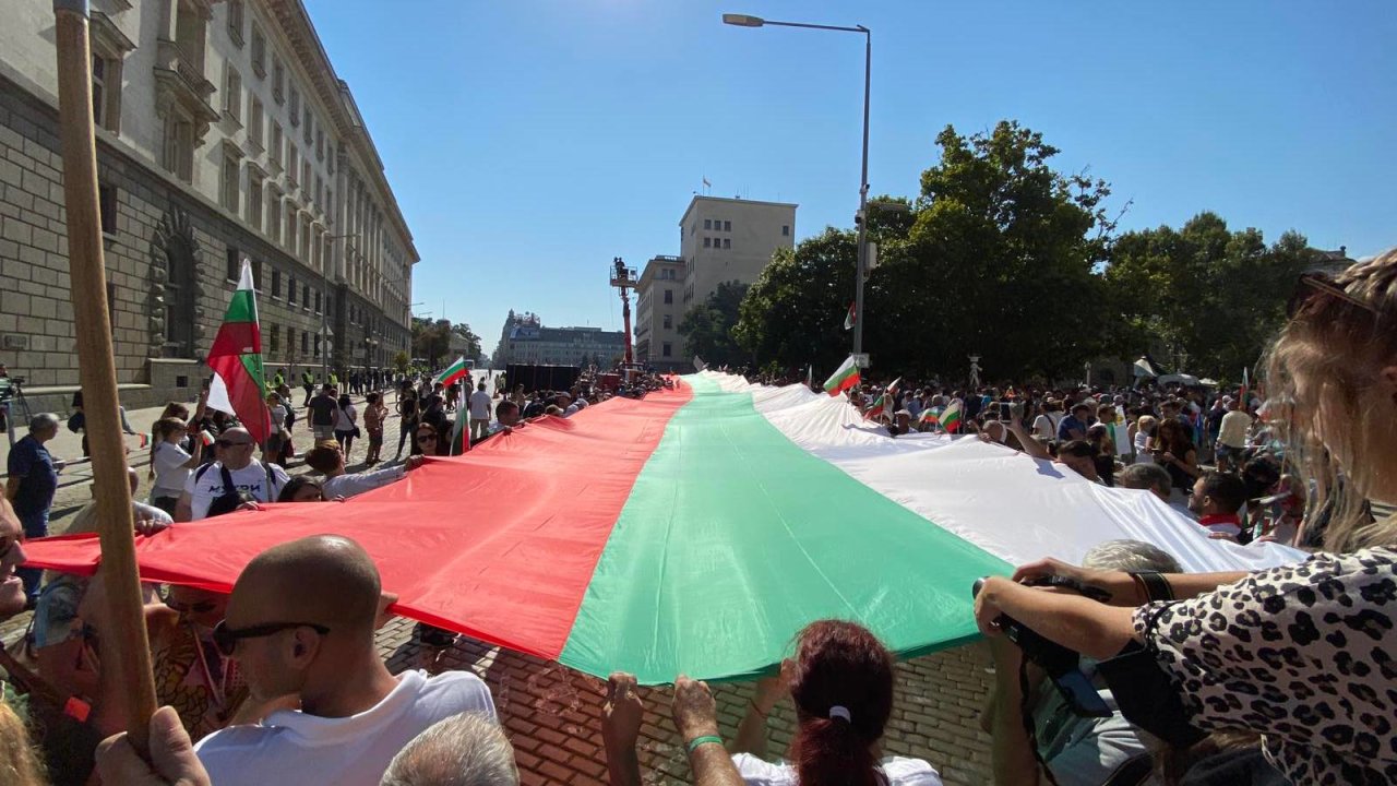 Протестиращите блокираха Триъгълника на властта. От Партийния дом те се придвижиха до Министерски съвет. Под прозорците на правителството демонстрантите скандираха "оставка". Спряно е движението по бул. "Цар Освободител" пред БНБ, а вече и по бул. "Дондуков". На жълтите павета протестиращите опънаха 50-метрово българско знаме. Трибагреникът бе осветен от архимандрит Дионисий.