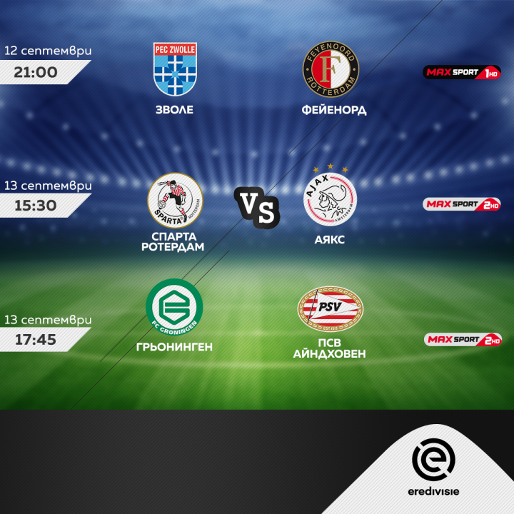 Този уикенд ще бъде даден и стартът на новия сезон в нидерландската Ередивизи, а MAX Sport ще излъчи пряко двубоите на трите обичайни заподозрени в борбата за титлата. В събота от 21:00 часа Зволе посреща Фейенорд (MAX Sport 1), в неделния ден Аякс гостува на Спарта Ротердам (15:30 ч., MAX Sport 2), a ПСВ Айндховен – на Грьонинген (17:45 ч., MAX Sport 2).