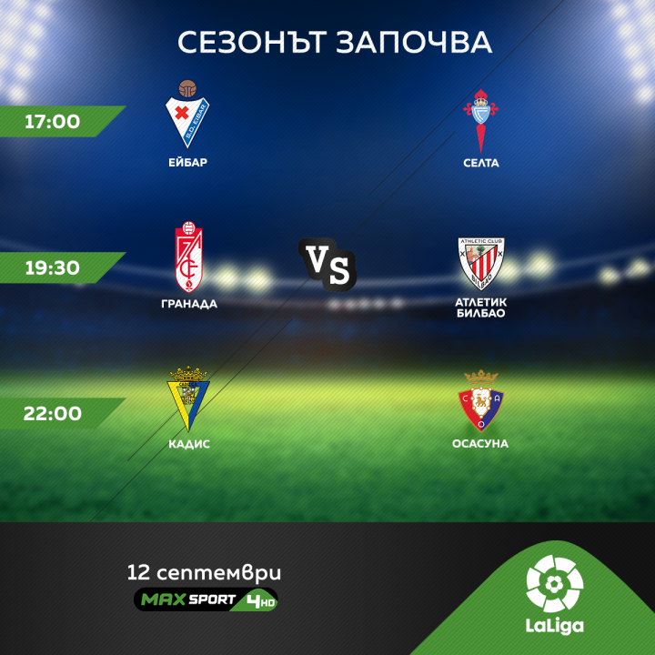 След кратка лятна пауза клубовете от испанската La Liga са готови отново да радват феновете на футбола. Стартът на сезон 2020-2021 на Пиренеите ще бъде даден този уикенд с цели 7 двубоя като всички те ще се излъчат пряко по MAX Sport 4. Привилегията да открият новата кампания се пада на тимовете на Ейбар и Селта Виго, които ще излязат в мач помежду си в събота от 17:00 часа. Веднага след това, от 19:30 часа, е време за сблъсъка между Гранада и Атлетик Билбао, а съботният ден ще се затвори с двубоя Кадис – Осасуна от 22:00 часа, съобщиха от компанията.