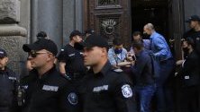 Протестиращите замерят с предмети полицията. Домати, яйца, бутилки минерална вода летяха към десетки полицейски служители, които са строени пред входа на бившия Партиен дом.