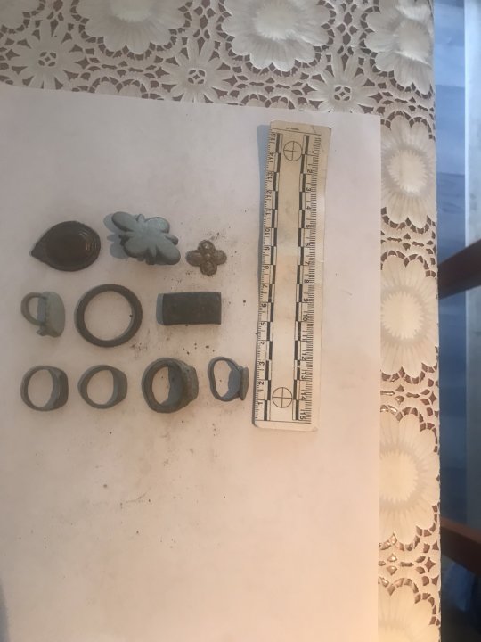 Сред незаконно държаните предмети има пръстени, метални плочки с различни изображения и форма, също и артефакти, чийто вид, произход и историческа стойност предстои да установят експертите.