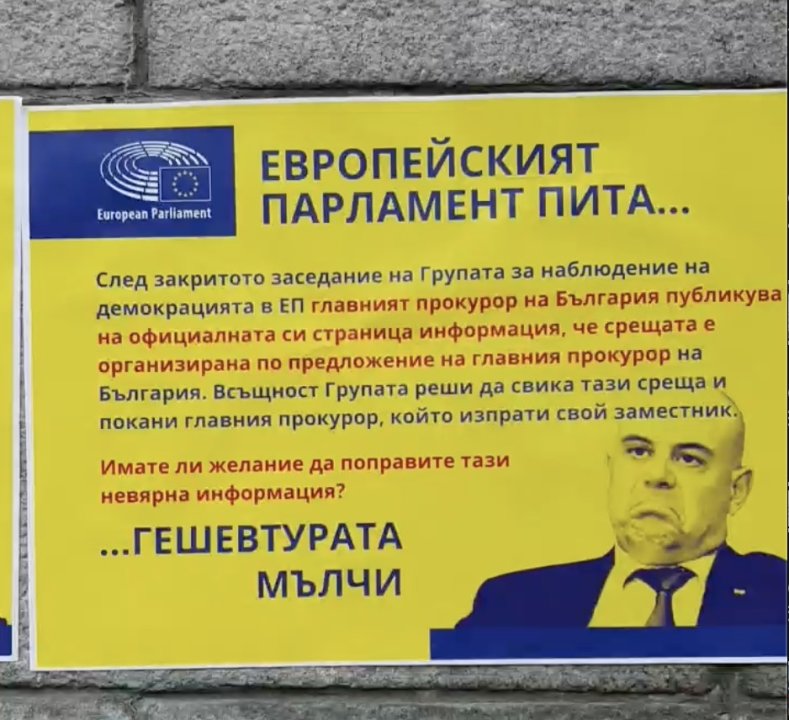 Членове на "МлаДа България" поставиха на фасадата на Съдебна палата стикери с 6 от въпросите, зададени от депутати в Европейския парламент, след изслушването в групата за наблюдение на демокрацията, върховенството на закона и основните права в ЕП.