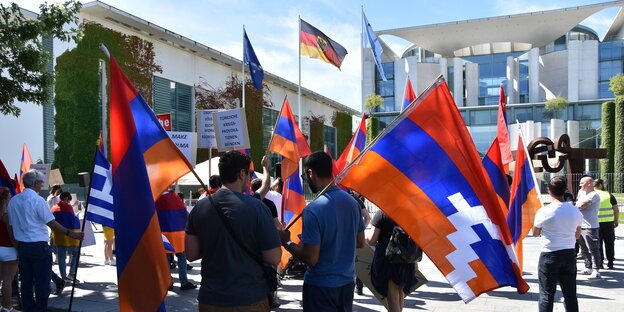 В ляво арменският флаг, а в дясно флагът на самопровъзгласилата се република Арцах (съставена от Нагорни Карабах и прилежащите седем района)
