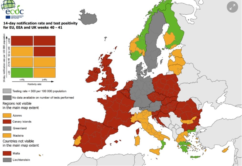 17 от общо 31 държави, които Европейският център покрива, бяха определени като червена зона, което означава, че за последните 14 дни случаите са повече от 50 на 100 хиляди души население, а процентът на позитивни тестове е над 4.