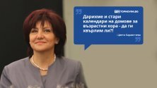 "На Министерството на социалното подпомагане дарихме брошури, календари - те бяха от стари години, но бяха прекрасни пейзажи, български пейзажи. И те ги раздадоха на старчески домове. Това трябваше ли да го изхвърлим? Това е голямата тема", каза Цвета Караянчева.