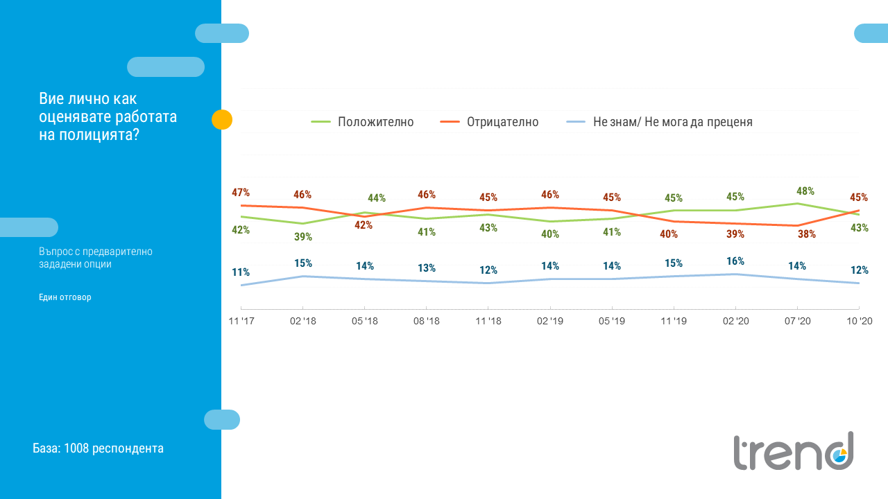 По отношение на полицията българите са раздвоени – 43% подкрепят органите на реда, а 45% им дават отрицателна оценка.