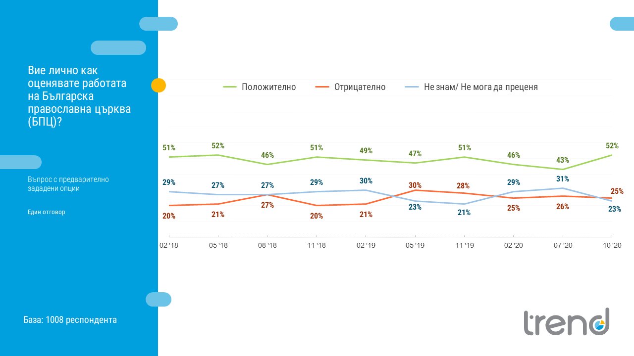 Институцията, на която най-голямата част от българите се доверяват, е българската православна църква, показва последното проучване на „Тренд“, отчитащо нагласите на обществото спрямо основните партии и институции за октомври.