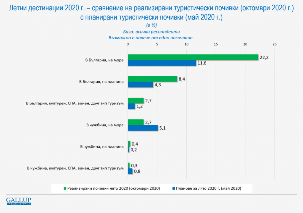 Например, през май 11,6% са планирали почивка на море у нас, а 22,2% (над 1.2 млн. души) са реализирали подобни почивка. 4,3% са планирали планина у нас, но 8,4% са я реализирали на практика. Обратно, 5,1% през май планираха море в чужбина, но само 2,7% (над 150 хиляди души) са го реализирали. Това е намаление от повече от половин милион в сравнение с една нормална година. Последното явно се дължи на ограниченията във връзка с коронавируса, отбелязват авторите на изследването.