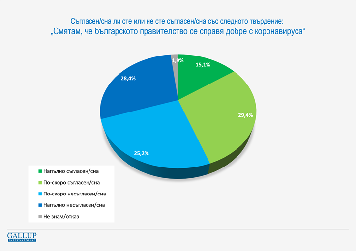 44,5% от българите смятат, че правителството се справя добре със ситуацията с коронавируса, а общо 53,6% са по-скоро несъгласни.