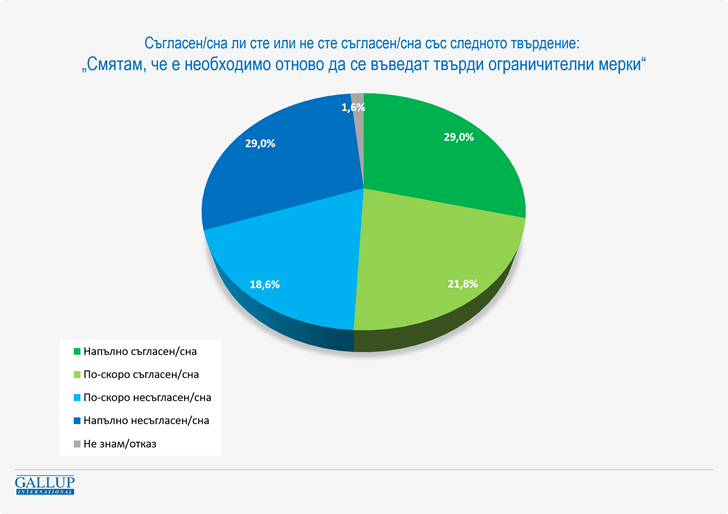 Мненията са почти равно разделени и по въпроса дали са необходими отново твърди ограничителни мерки. От лятото насам явно има и известно „свикване с мисълта“ – вероятно заради новините от други европейски страни. Ако при предходния скок, през лятото, около 60% са били несъгласни, а под 40% – съгласни, сега отговорите са в съотношение 50,8% съгласни срещу 47,6% несъгласни.