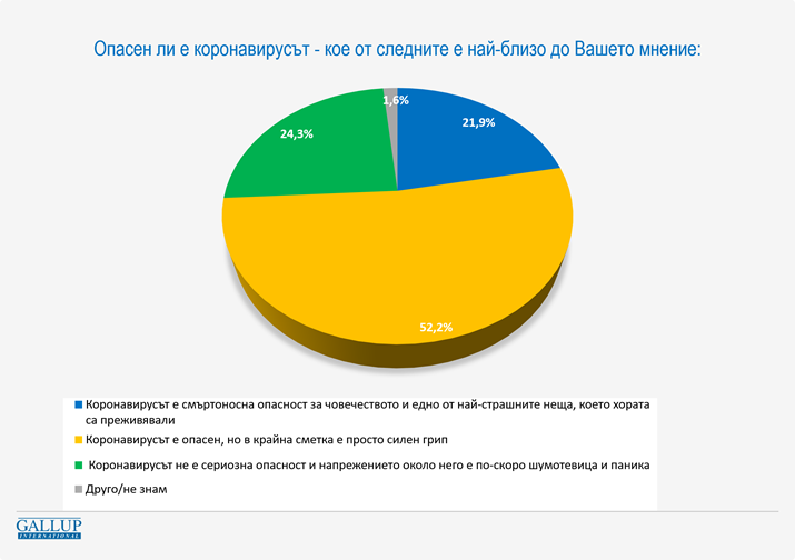 21,9% от анкетираните смятат, че „коронавирусът е смъртоносна опасност за човечеството и едно от най-страшните неща, което хората са преживявали“. 52,2% избират по-умереното „коронавирусът е опасен, но в крайна сметка е просто силен грип“. 24,3% намират, че „коронавирусът не е сериозна опасност и напрежението около него е по-скоро шумотевица и паника“.