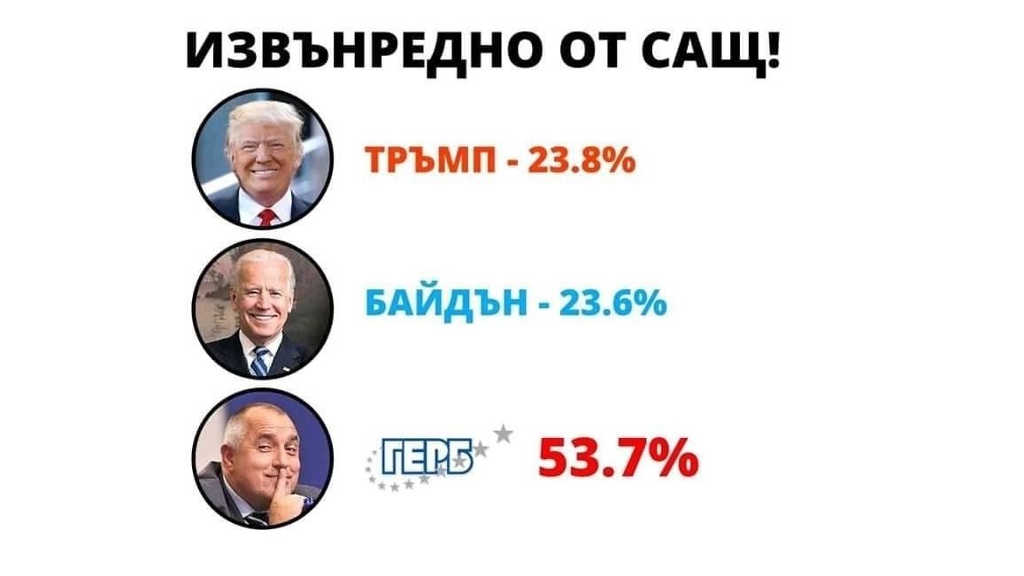 Най-разпространена е шегата с включването на българския премиер Бойко Борисов и партията му ГЕРБ в президентската надпревара. Във Facebook се появиха се следните изборни резултати: „Извънредно от САЩ: Тръмп – 23.8%, Байдън – 23.6%, ГЕРБ – 53.7%“.