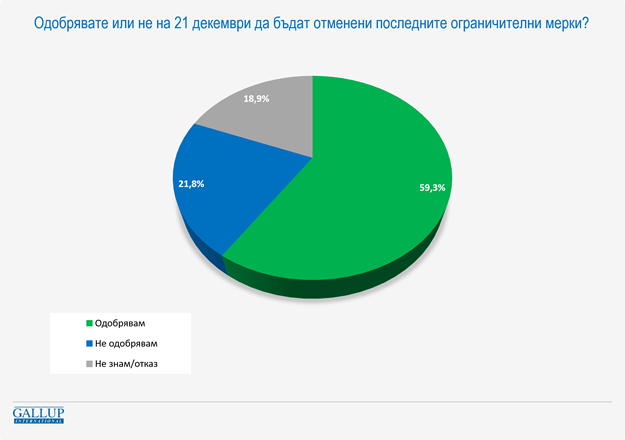 Сериозно мнозинство от 59,3% одобрява заявения от Бойко Борисов край на ограничителните мерки на 21 декември. Други 21,8% са против, а останалите не могат да преценят. От агенцита посочват, че вероятно това е свързано и с липсата на сериозна убеденост, че на този етап на дифузно разпространение строгите мерки въобще работят.