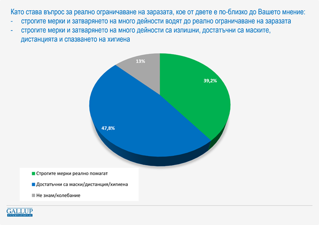 47,8% приемат, че само маски, дистанция и хигиена биха били достатъчни. 39,2% смятат, че твърдите мерки реално работят, а останалите се колебаят. От "Галъп" напомнят, че преди няколко седмици българското общество по-скоро подкрепи новите по-твърди мерки. Конкретните впечатленията на обществото обаче явно накланят везните в друга посока.