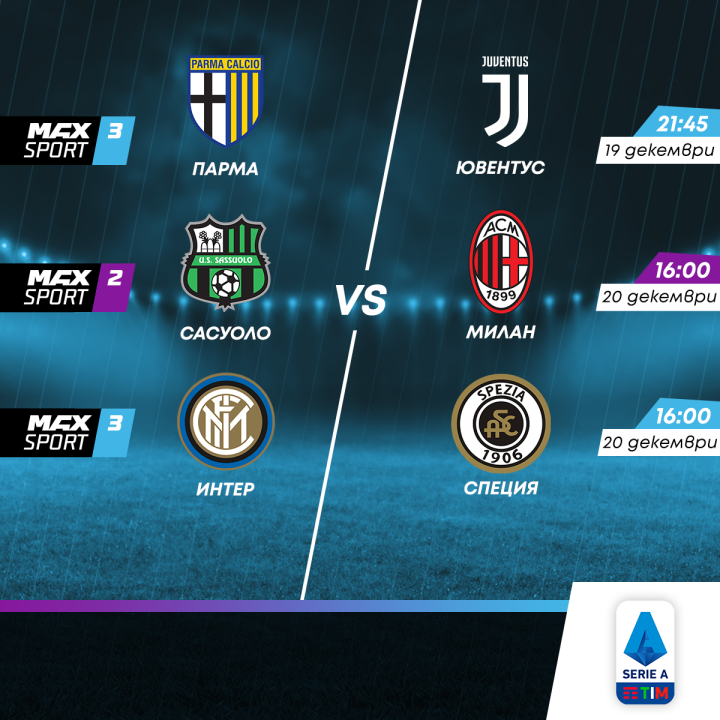 Програмата в Серия А също ще предложи на феновете някои любопитни сблъсъци. Лидерите Милан, Ювентус и Интер ще излязат срещу по-скромни тимове, но това в никакъв случай не им гарантира трите точки. В събота от 21:45 ч. Юве гостува на Парма, а водачът в класирането Милан, който е в серия от две последователни равенства, излиза срещу Сасуоло. Скромният тим от Емилия Романя стартира силно новия сезон и към момента заема 6-ата позиция в класирането. Интер пък има на хартия най-лесната задача да се справи у дома срещу новака Специя. Трите двубоя на лидерите ще се излъчат пряко по MAX Sport 3.
