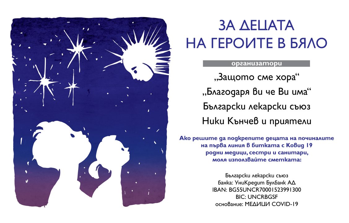 Преди две седмици Българският лекарски съюз, с подкрепата на водещия на „Важното за теб“ Ники Кънчев, Българската асоциация на професионалистите по здравни грижи и доброволческите организации „Защото сме хора” и „Благодаря Ви, че Ви има”, стартира инициатива за финансово подпомагане на децата на починалите от Covid-19 медици под надслов: „За децата на героите в бяло”.