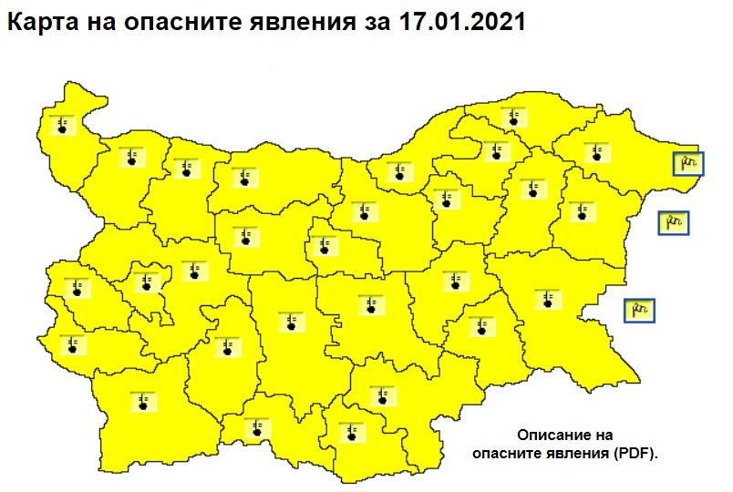 Жълт предупредителен код за опасност от студено време е обявен за цялата страна. Температурите ще се понижават още, ще са по-ниски от обичайните за втората половина на януари и ще е много студено. Минималните ще са предимно между минус 12 и минус 7 градуса, в Горнотракийската низина и по Черноморието - малко по-високи. Дневните в почти цялата страна ще са отрицателни - между минус 5 и 0 градуса.