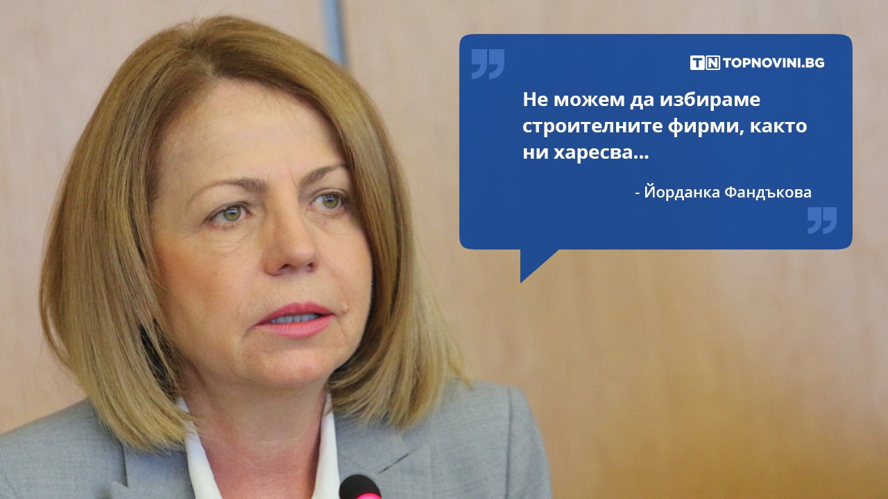 "Има много ясен закон за обществените поръчки. Ние работим по закон, не можем да избираме фирмите така, както на нас ни харесва. Мен ако ме питате, по-голямата част от фирмите в София не трябва да работят изобщо. Не само в София, изобщо това са проблеми на строителния бранш, които са известни", това каза столичният кмет Йорданка Фандъкова в ефира на БНТ по повод работата на общината с фирми, които допускат чести нарушения.
