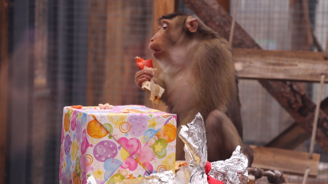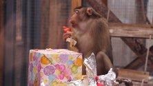 „В голямата кутия имаше гумена играчка, която е от кучешки магазин, за да бъде по-здрава, защото той точно като едно малко дете е прахосник – къса, хвърля и по тази причина играчката трябваше да оцелее малко повече. Имаше много орехи, ябълки, мандарини, всичко което е характерна храна за една маймуна. Също много плюшени играчки, на които той много се радва и обича, но за съжаление много бързо ги къса”, разказва пред Нова телевизия Ани Костадинова, гледач в зоопарка.