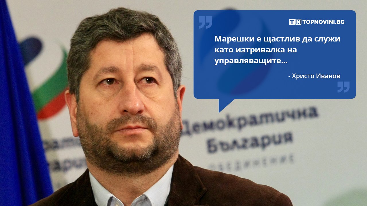 „Марешки е представител на една многолюдна категория в българската политика, която се занимава с подмяна на истини и факти. Винаги е щастлив да служи като изтривалка на управляващите“. Това каза съпредседателят на „Демократична България“ Христо Иванов в ефира на bTV. Думите са му в отговор на коментара на лидера на „Воля“ Веселин Марешки, който го нарече „пропаднал политик“.