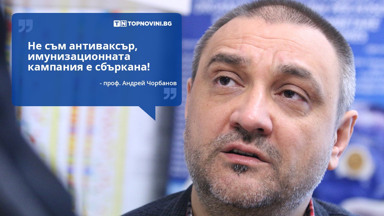 „Не смятам, че попадам в групата на антиваксърите – аз разработвам ваксини цял живот. Смятам, че кампанията за имунизация в България е изключително стихийно организирана – без ясно послание кой и защо трябва да се имунизира. Би следвало да се започне тези хора, които са най-уязвими и които най-лесно могат да имат тежък или летален край от срещата с вируса – много възрастните хора и хората с хронични заболявания. Възприетият подход първо да бъдат имунизирани тези, които са най-близко и в контакт с вируса – не смятам, че беше редно да се направи така.“ Това коментира проф. Андрей Чорбанов, директор на департамент „Имунология“ в Института по микробиология на БАН.