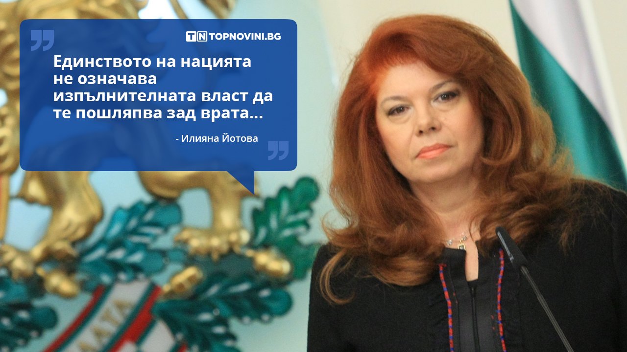 „Единството на нацията не означава да стоиш пред изпълнителната власт, да те пошляпват зад врата, да позволяваш някой да ти казва да стоиш на този президентски пост и да топлиш мястото, пък после ще видим... Това означава една силна и различна личност, която да има различен поглед на това как трябва да се борави в политиката на една европейска държава“, заяви вицепрезидентът Илияна Йотова в ефира на bTV.