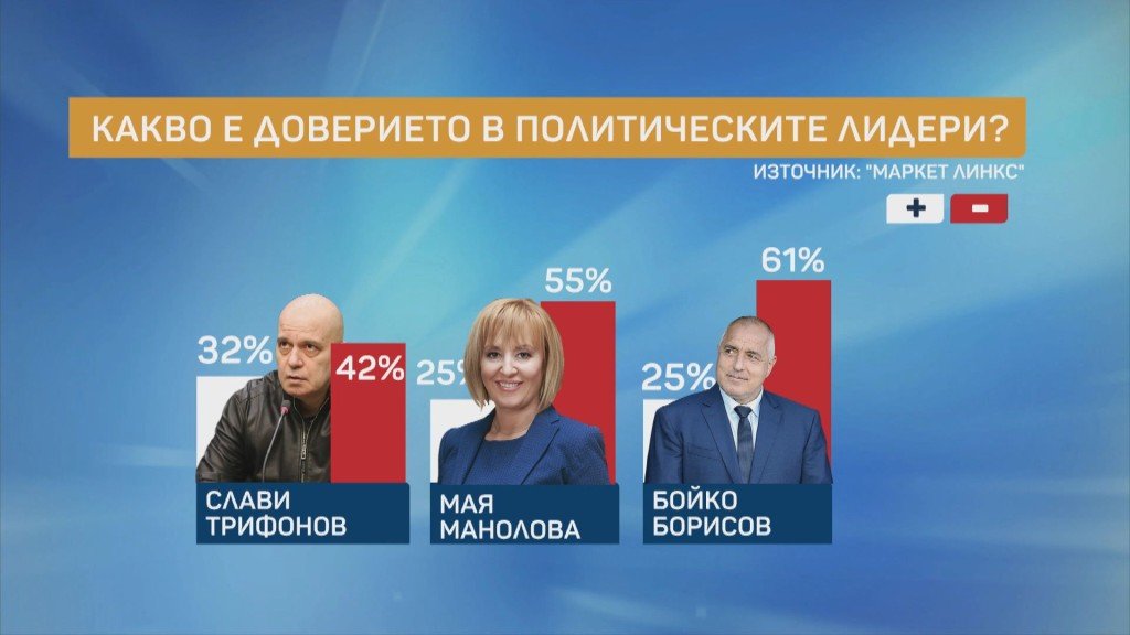Слави Трифонов е с 32% политическо доверие и изпреварва премиера Бойко Борисов, който получава 25% доверие. Това показва проучване, финансирано и реализирано съвместно от bTV и „Маркет линкс“*.