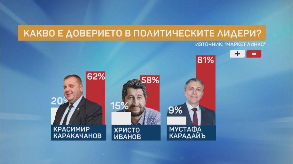 С 25% подкрепа се ползва и лидерът на „Изправи се.бг“ Мая Манолова. Председателят на ВМРО Красимир Каракачанов е с 20% доверие, съпредседателят на „Демократична България“ Христо Иванов – с 15%, а лидерът на ДПС Мустафа Карадайъ – с 9%.