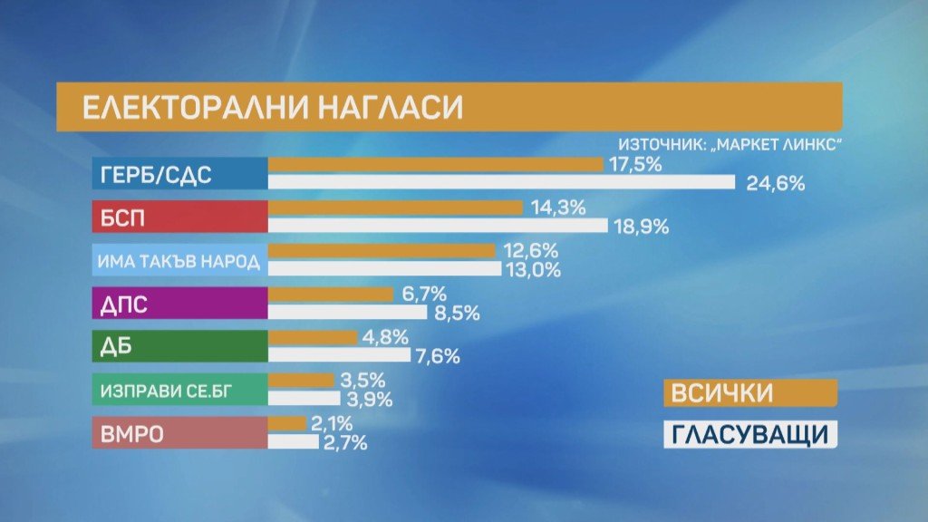 24.6% биха подкрепили ГЕРБ/СДС, 18.9% - БСП, 13% биха гласували за „Има такъв народ“, 8.5% - за ДПС, 7.6% - за „Демократична България“, 3.9% биха подкрепили „Изправи се! Мутри, вън!“, а 2.7% - ВМРО.
