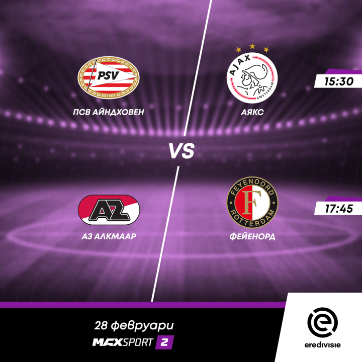 Неделният ден по MAX Sport 2 пък ще е посветен на два страхотни сблъсъка между представители на Топ 4 в класирането на нидерландската Ередивизи. От 15:30 часа е мегадербито между водачите в класирането ПСВ Айндховен и Аякс, а малко след това – от 17:15 часа, АЗ Алкмаар и Фейенорд излизат в директен сблъсък за третата позиция.